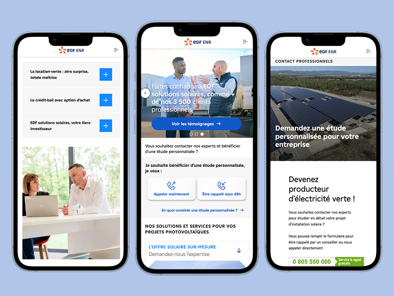 Le parcours guide l’utilisateur dans la découverte des solutions, l’aide à se projeter dans son projet et facilite la prise de contact pour passer à l’action.